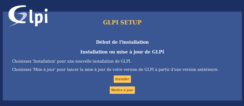 - Visiter la page de GLPI pour configurer via l'interface Web http://ip/glpi