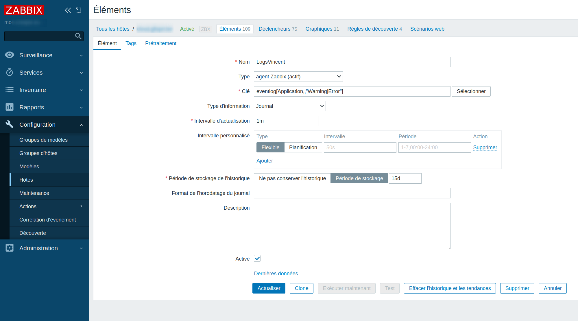 Créer un élément avec la clé eventlog[Application,,“Warning|Error”] pour un Agent Zabbix Active. Type d'information Journal