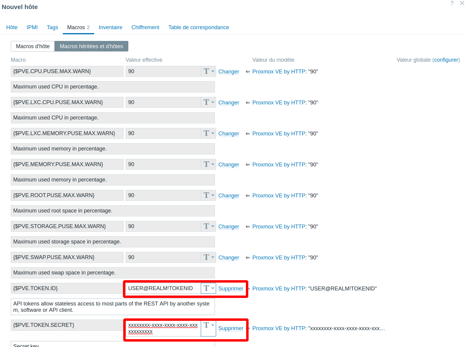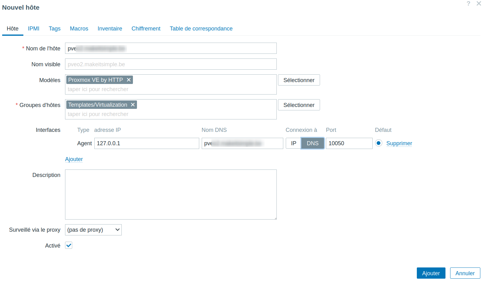 Créer un nouvel hôte, choisir le modèle Proxmox