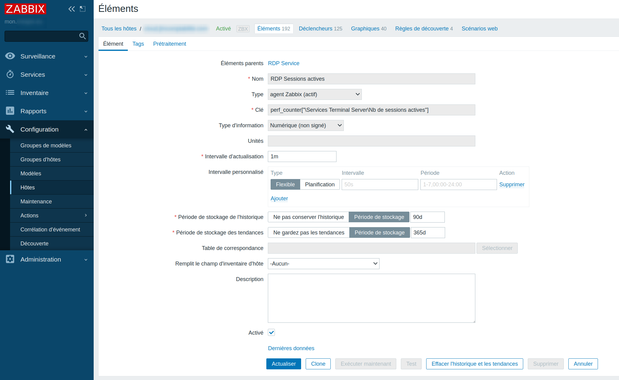 Il est également possible d'écouter les sessions actives en créant un élément avec une clé: perf_counter[“\Services Terminal Server\Nb de sessions actives”] ou perf_counter[“\Terminal Services\Active Sessions”] en anglais sur un Zabbix Agent Actif.