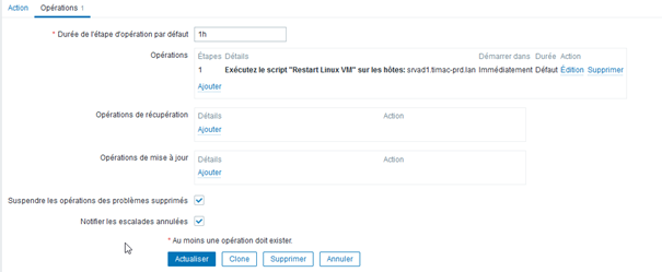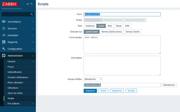 - Dans Administration → Script, créer un nouveau script qui devra être envoyé sur le zabbix agent