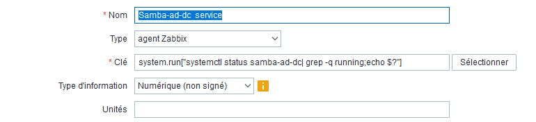Ici on configure une clé/commande dans le ficier conf de l'agent. Après redémarrage de celui-ci, on peut faire un nouveau élément dans le UI de Zabbix