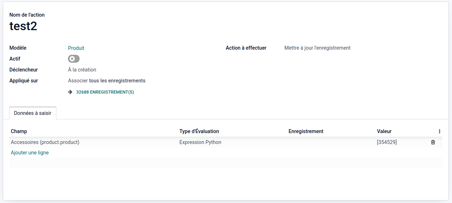 On peut mettre à jour un champ many2many en l'écrivant de la sorte (ou on peut mettre plusieurs valeurs [123,456]