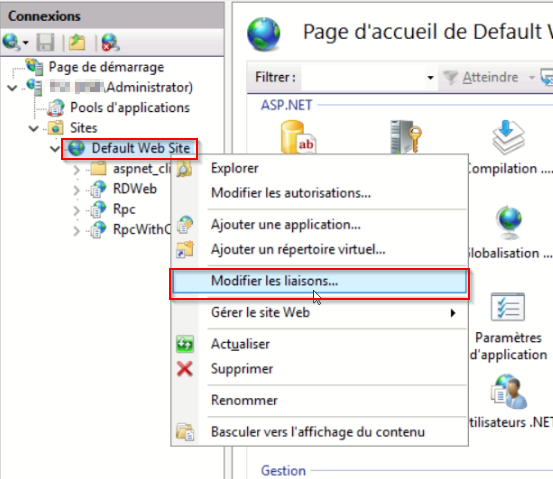Faire un click droit sur le site sur lequel vous souhaitez modifier le certificat (ou prendre Default Web Site) et choisir “Modifier les liaisons”