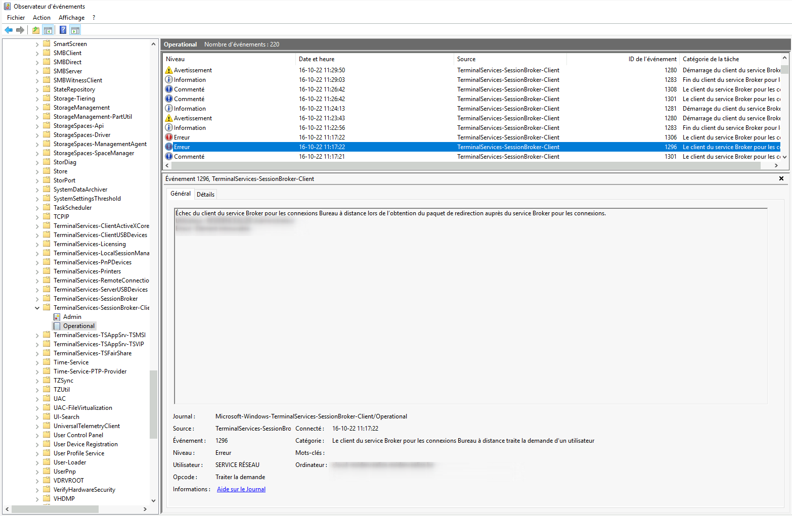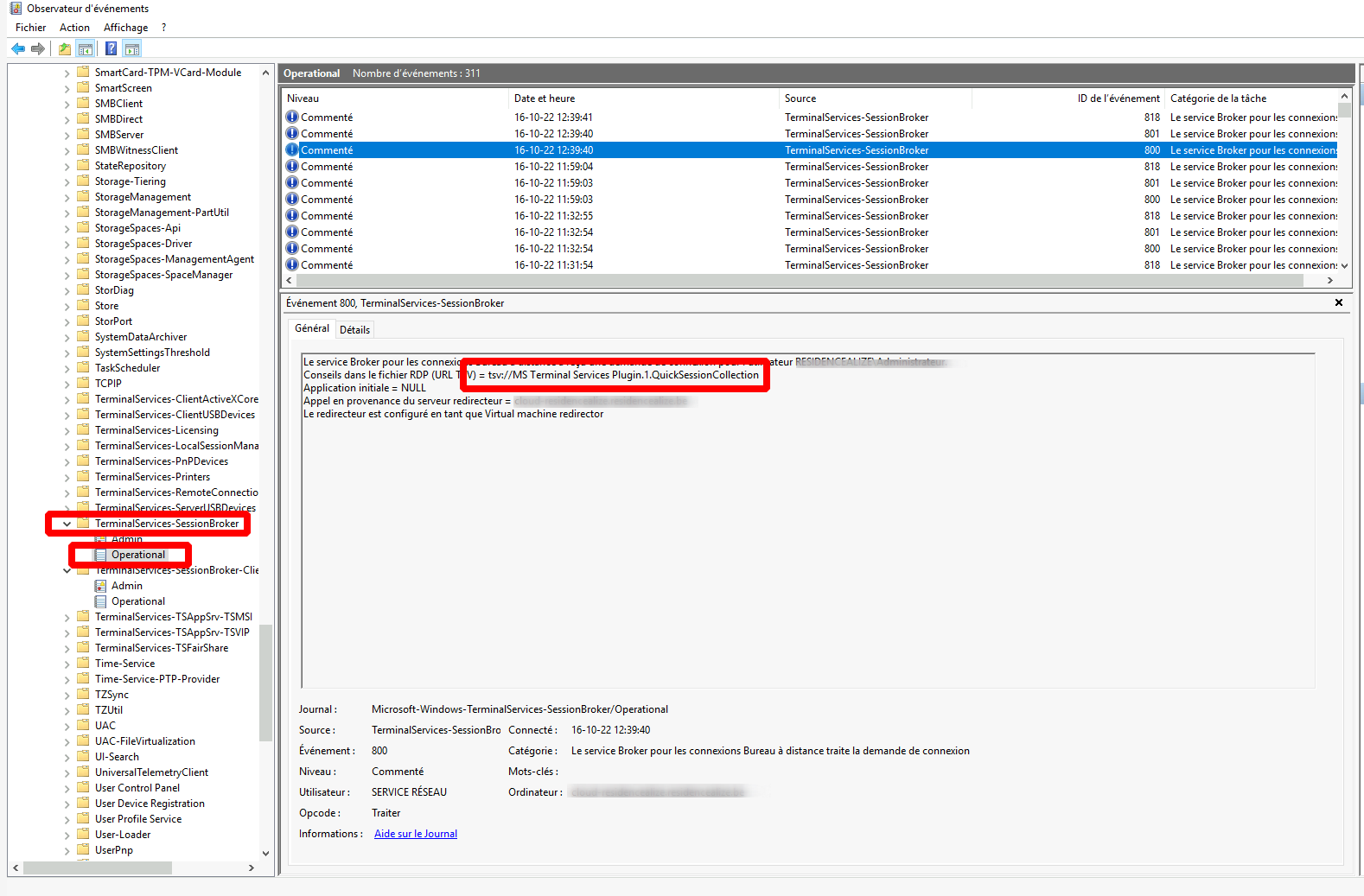 Dans l'Observateur d'évènement, aller “Journaux des applications et services” → “Microsoft” → “Windows” → “TerminalServices-SessionBroker” → “Operational” et retrouvez l'url qui est donné en retour d'un évènement de type 800