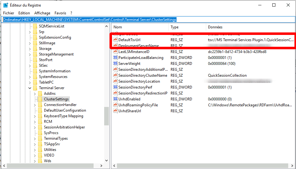Dans la base de registre, créer une nouvelle clé dans “HKLM\SYSTEM\CurrentControlSet\Control\Terminal Server\ClusterSettings” nommée DefaultTsvUrl avec la valeur copiée de l'étape précédente